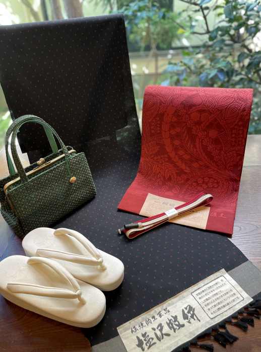 今月の着物は「渡文の纐纈(こうけつ)帯と塩沢蚊絣」です