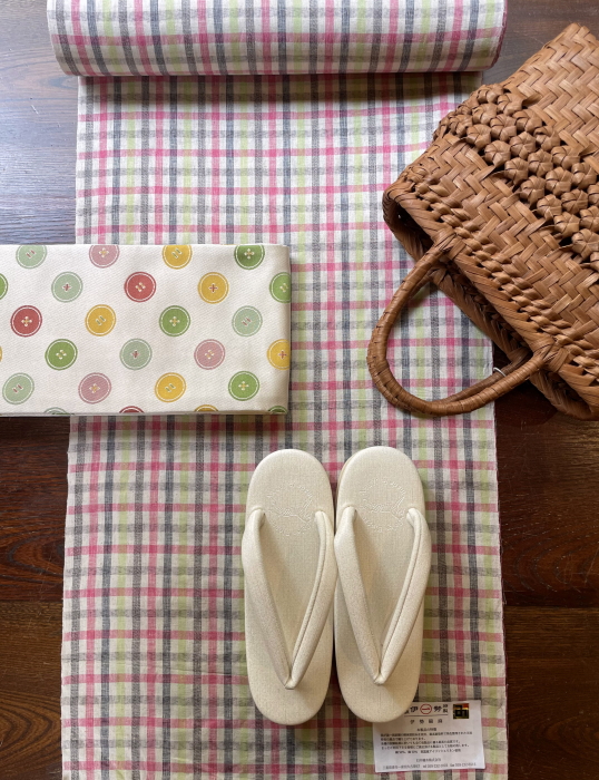 今月の着物は「綿麻のPOPな着物・伊勢綿麻のキモノとおりびと半幅帯」です。