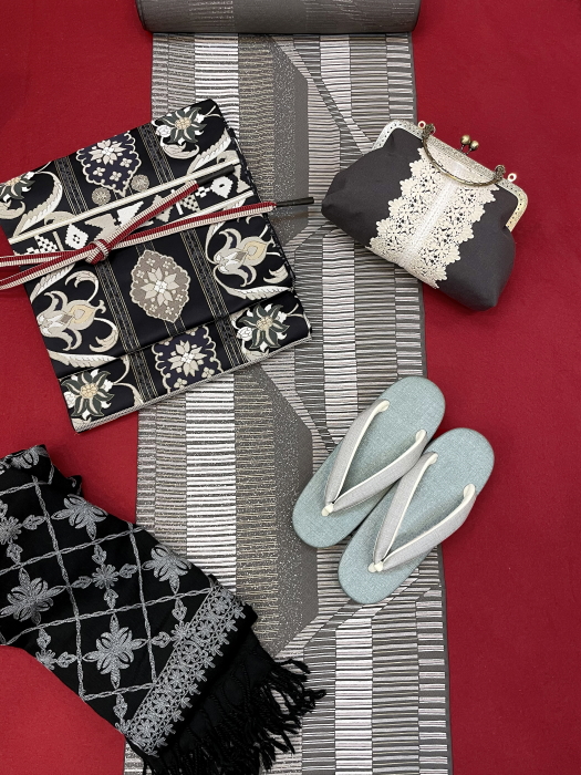 コーデの帯は西陣となみ帯の更紗大全柄、季節らしいモノトーンの帯は