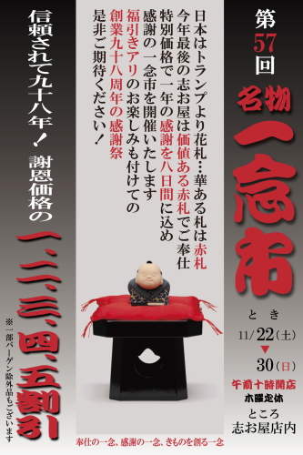 - 昭和二年よりお引き立てを賜り おかげ様で創業九十八年になりました。これもひとえにお客様の支えがあってのことと、心より感謝いたします。この感謝の気持ちをお客様への「感謝の一念」「奉仕の一念」「きものを創る一念」にかえまして、令和七年最後の大バーゲンセール・「一念市」を開催いたします!今年最後の創業祭は感謝を込めての恩返し!全集中の八日間1~5割引の大放出!昨日までのあの商品が割引です。他にも目玉品続出、品切れ御免の一念市です。皆様お誘い合わせの上のご来店心よりお待ち申上げます。